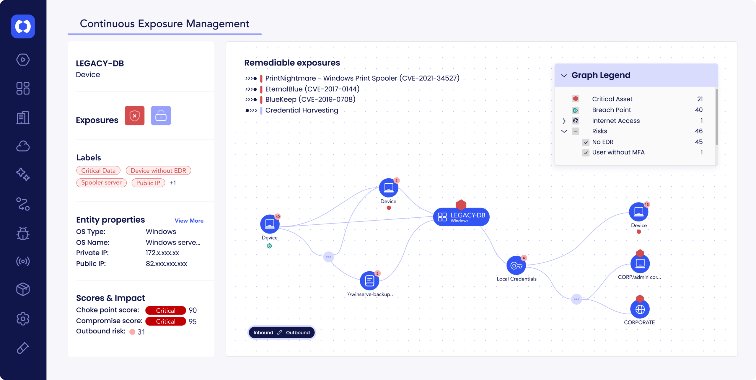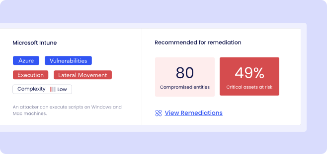 XM Cyber 運用專利演算法,精準識別攻擊路徑中的關鍵節點(亦稱攻擊路徑的阻斷點)。在成千上萬個弱點中,快速鎖定通往關鍵資產的必經之路,讓資安團隊只需優先修補少數高影響弱點,即可有效中斷大量潛在攻擊路徑,大幅提升修補投資報酬率。